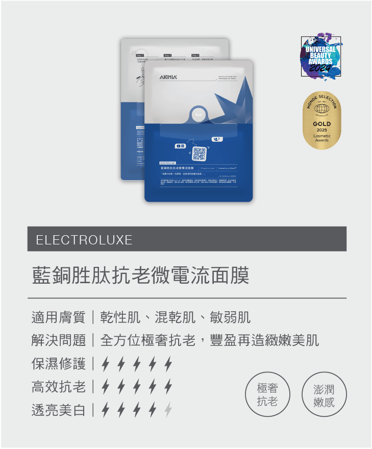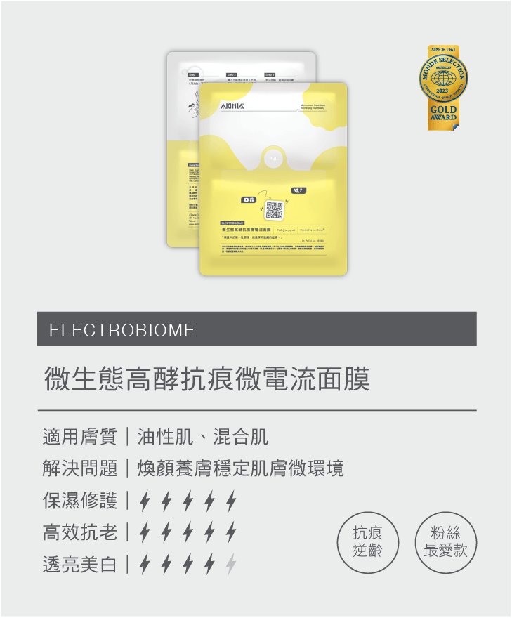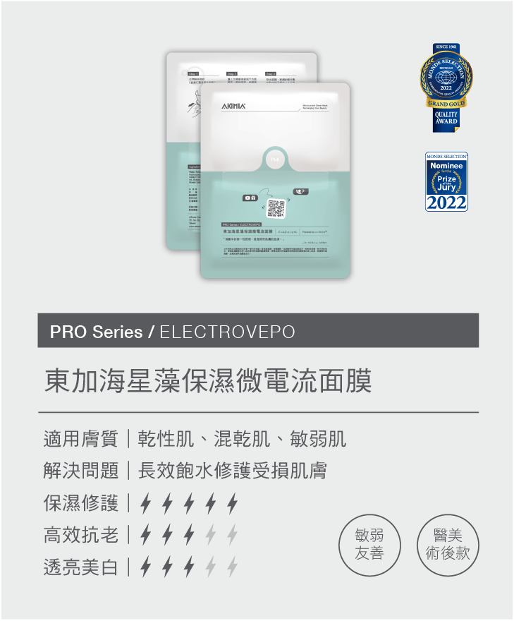 AKIMIA微電流面膜,獲2023年世界品質評鑑大賞金獎。面膜自帶微電流技術,無需額外儀器,能深層滲透精華液,改善膚質。