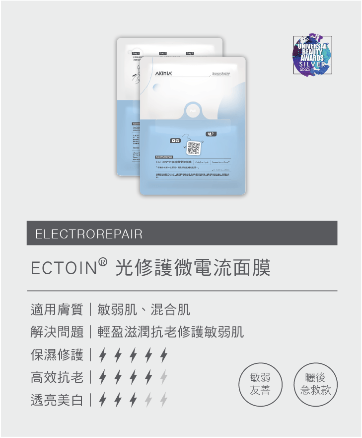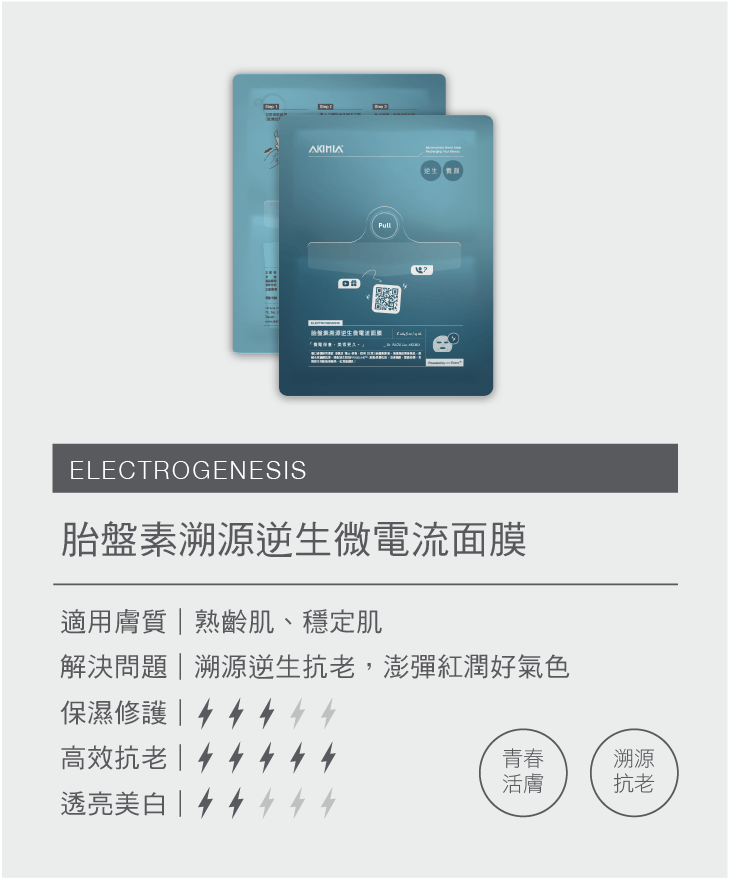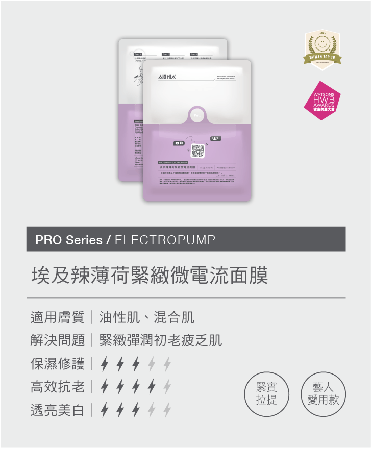 台大醫工博士創立的AKIMIA品牌在面膜紙上印刷電池,產生微電流,無需額外儀器。面膜材質親膚且不致敏,結合高酵精粹和益生元,保濕抗痕,含有A醇,還原少女肌。