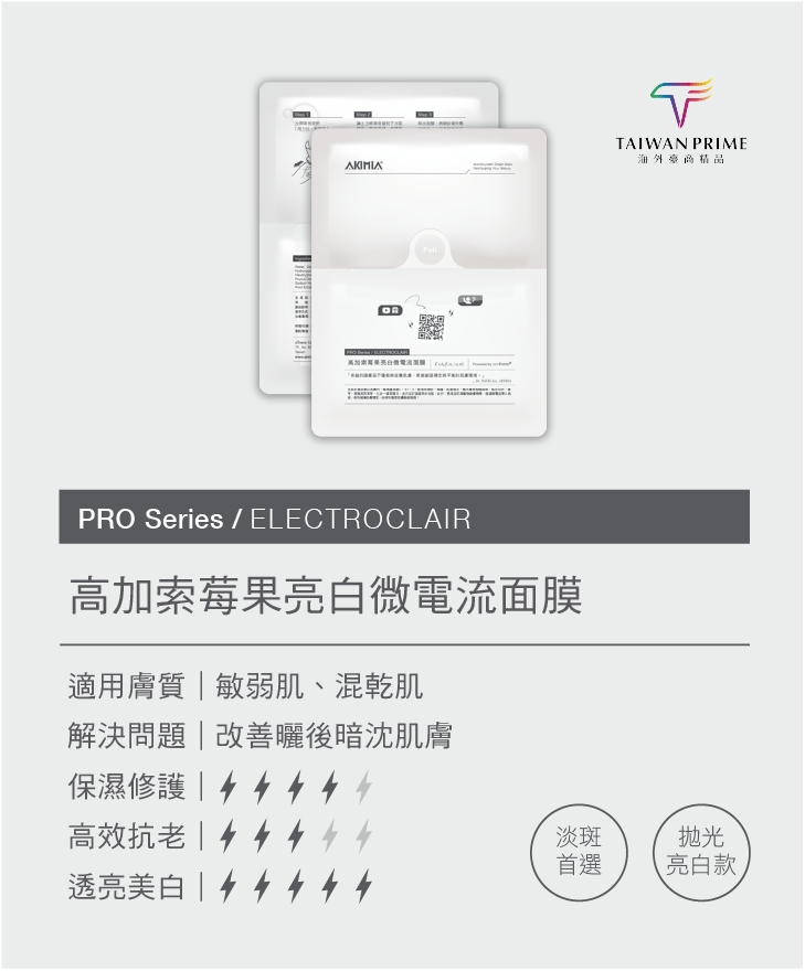 台大醫工博士創立的「AKIMIA」品牌,運用微電滲透科技打造高效護膚產品。其微電流面膜結合高酵精粹和益生元,推送溫和機能成分,改善膚況,提升肌膚健康細嫩。