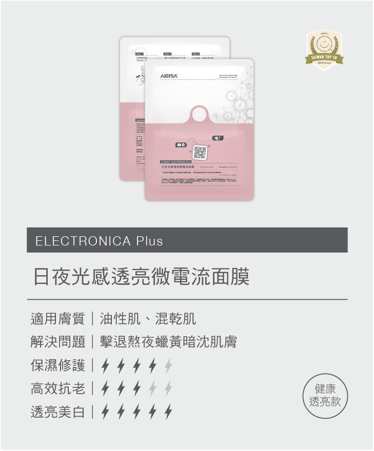 AKIMIA 熬夜蠟黃肌的救星—日夜光感透亮微電流面膜,獲得『2022嘉誠微笑盃TaiwanTop10美妝品獎』。