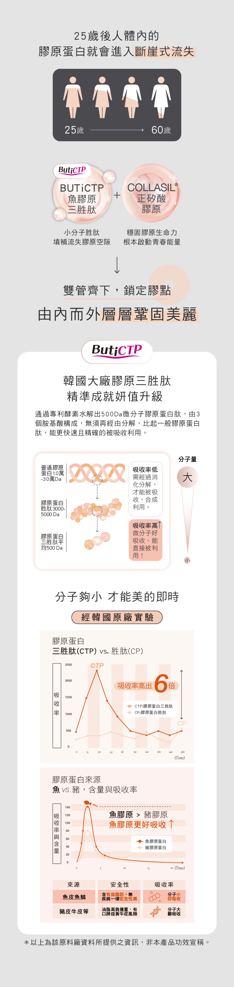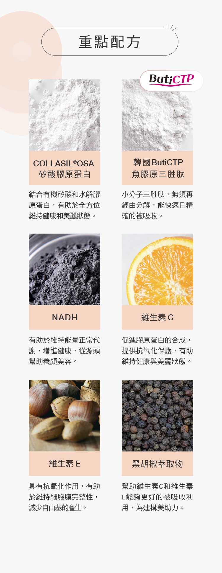 專利COLLASIL®OSA 矽酸膠原蛋白與韓國專利三胜肽膠原蛋白,雙管齊下,由內而外,層層鞏固美麗。