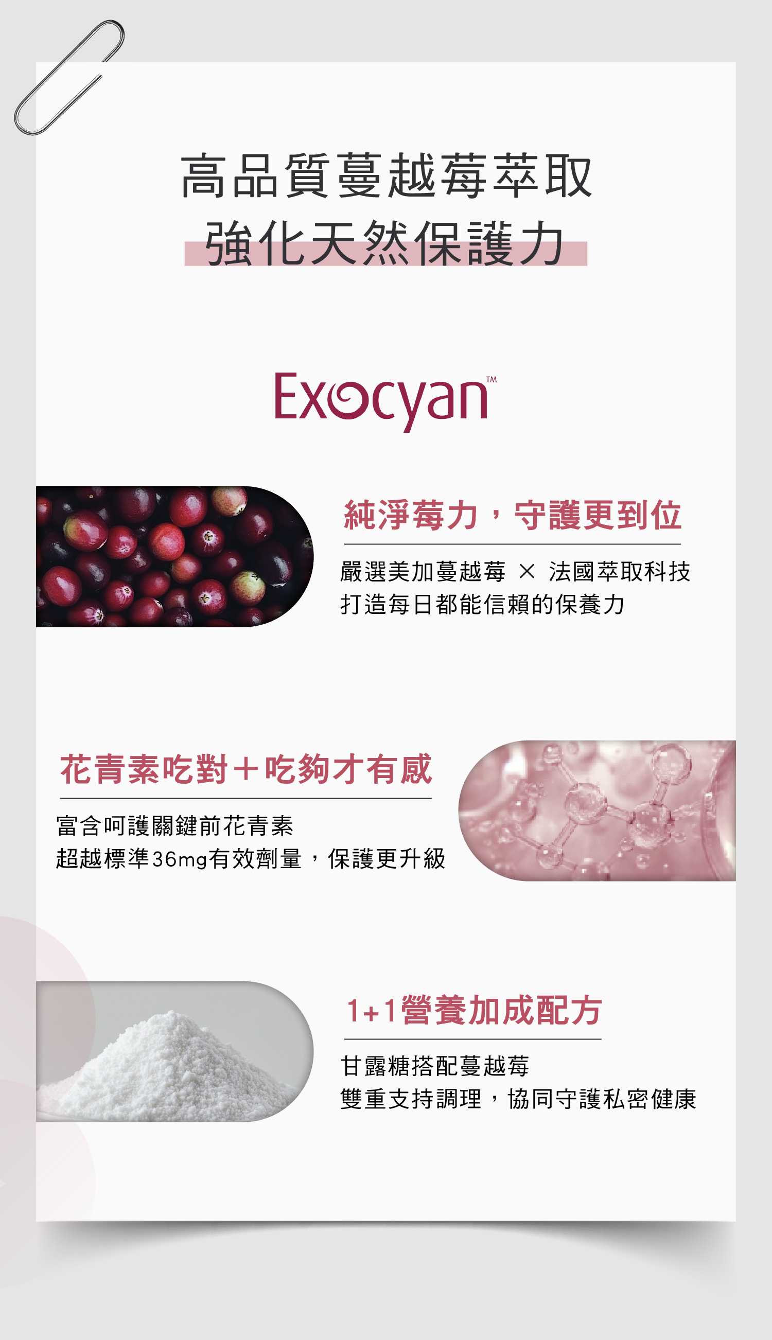 全面啟動女性呵護!嚴選法國Exocyan蔓越莓萃取與台灣專利GFU3複合乳酸菌、LR1鼠李糖乳桿菌攜手維持私密健康狀態。