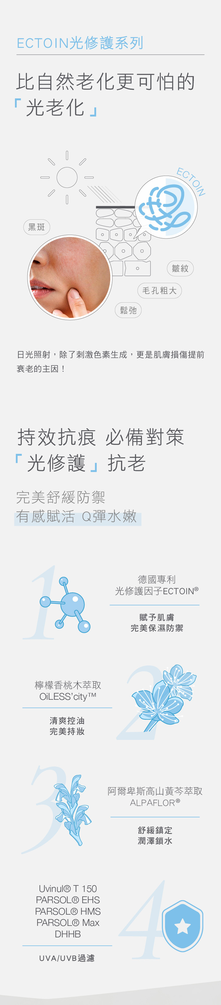 ECTOIN®光修護因子、檸檬香桃木萃取、阿爾卑斯高山黃岑萃取、Uvinul@T150、PARSOL®EHS 、PARSOL®HMS、PARSOL®Max、DHHB。