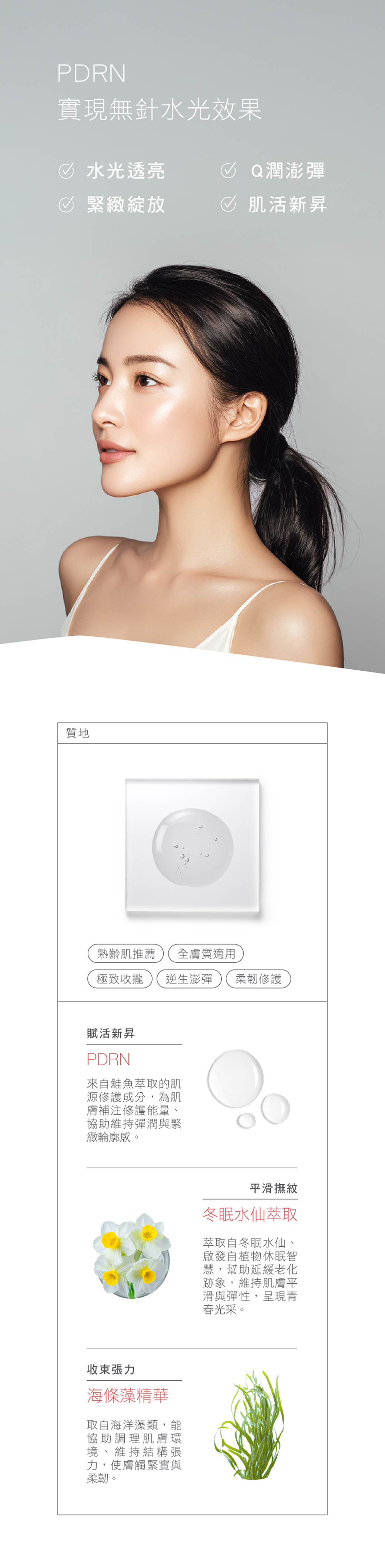 *產品中使用的PDRN為鮭魚DNA萃取物,敬請素食者評估自身情況選擇使用。