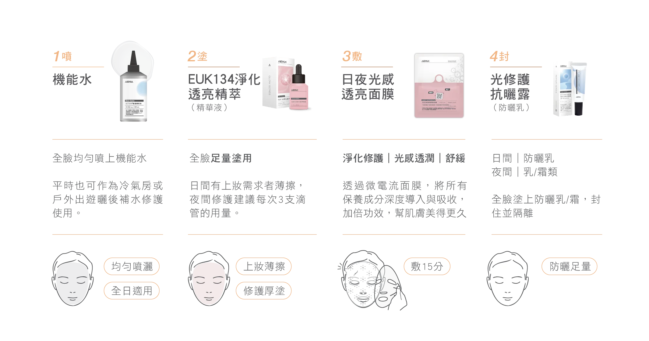在無開放性傷口的前提下,建議3-7天內,先以保濕款做修護,讓⽪膚保持⽔潤。待膚況穩定後再使用其他功效型產品。