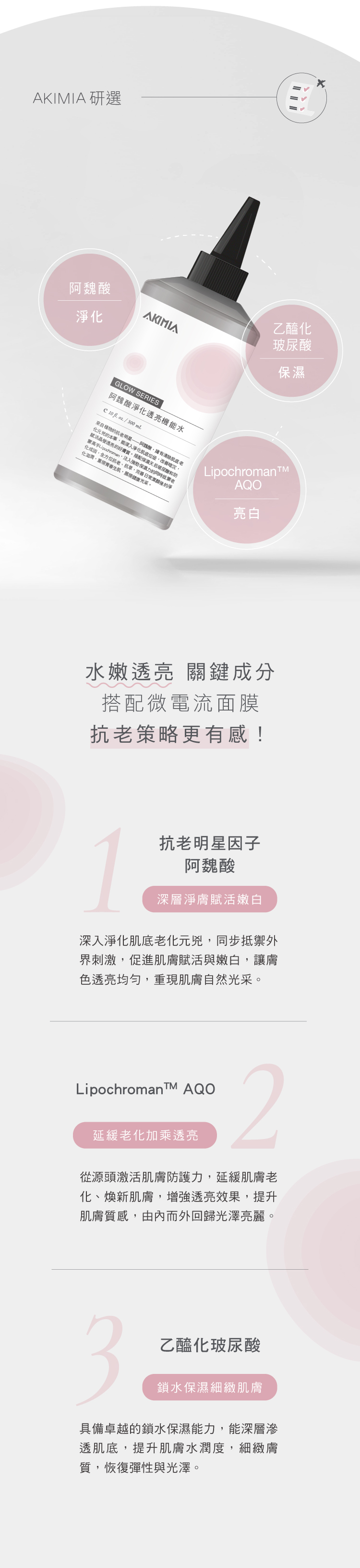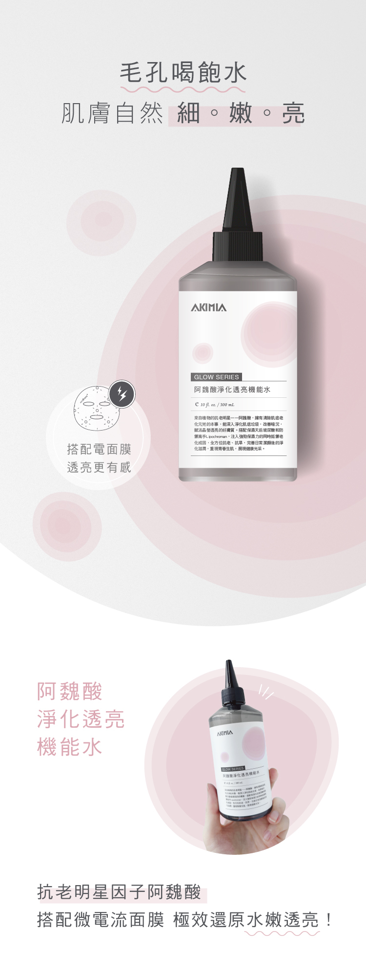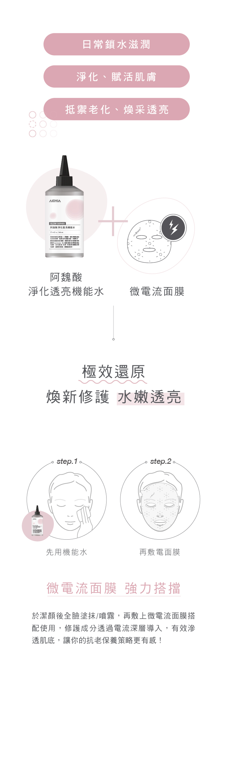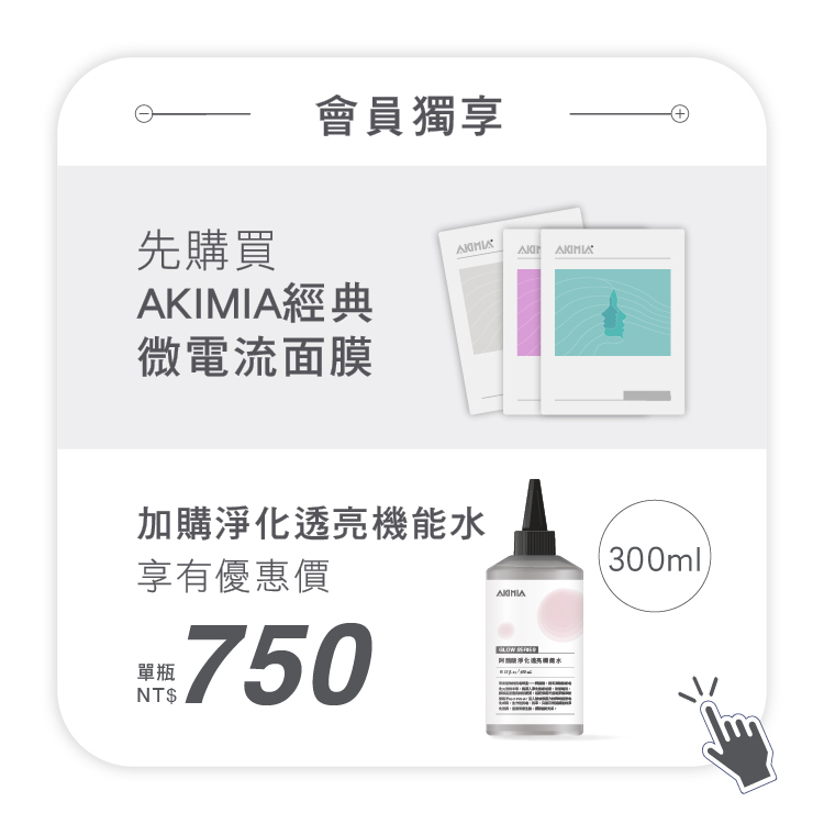 AKIMIA推薦每週三次,於潔顏後,全臉塗抹,再搭配微電流面膜敷用,達到深層滲透、加倍功效的淨化保養!