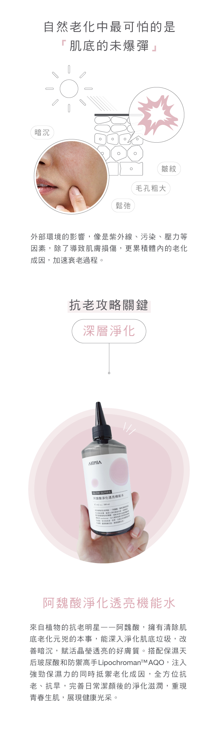 專為「微電流保養」打造的深層淨膚型阿魏酸淨化透亮機能水,可替代日常保養中的化妝水步驟。