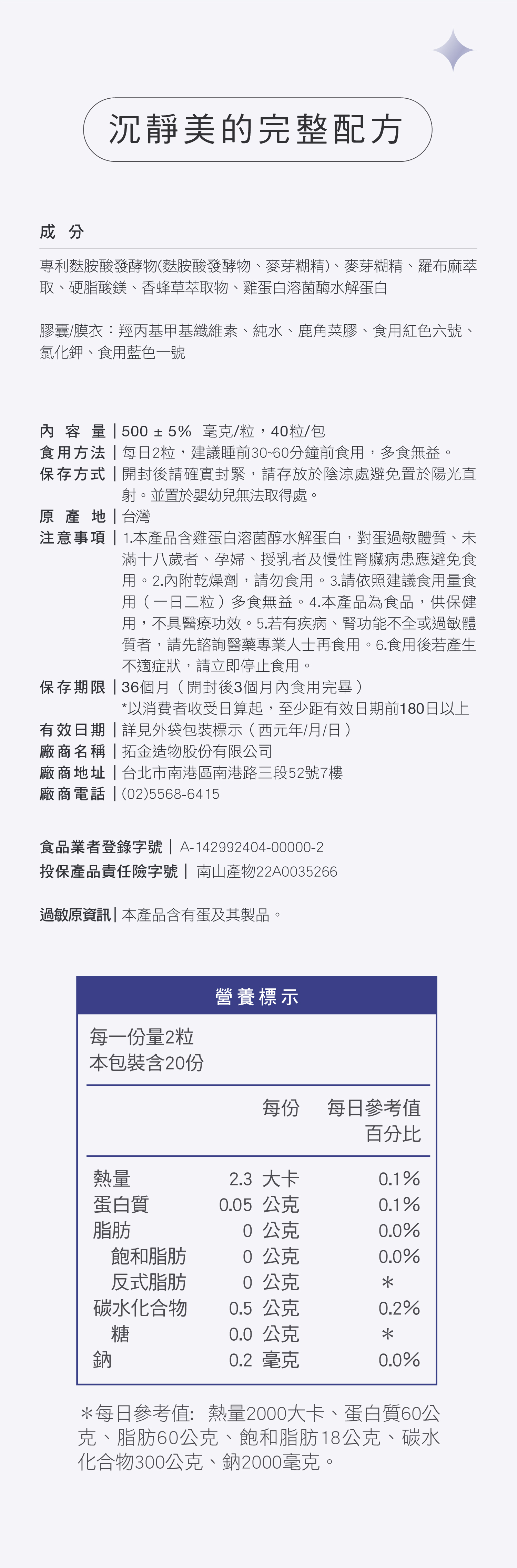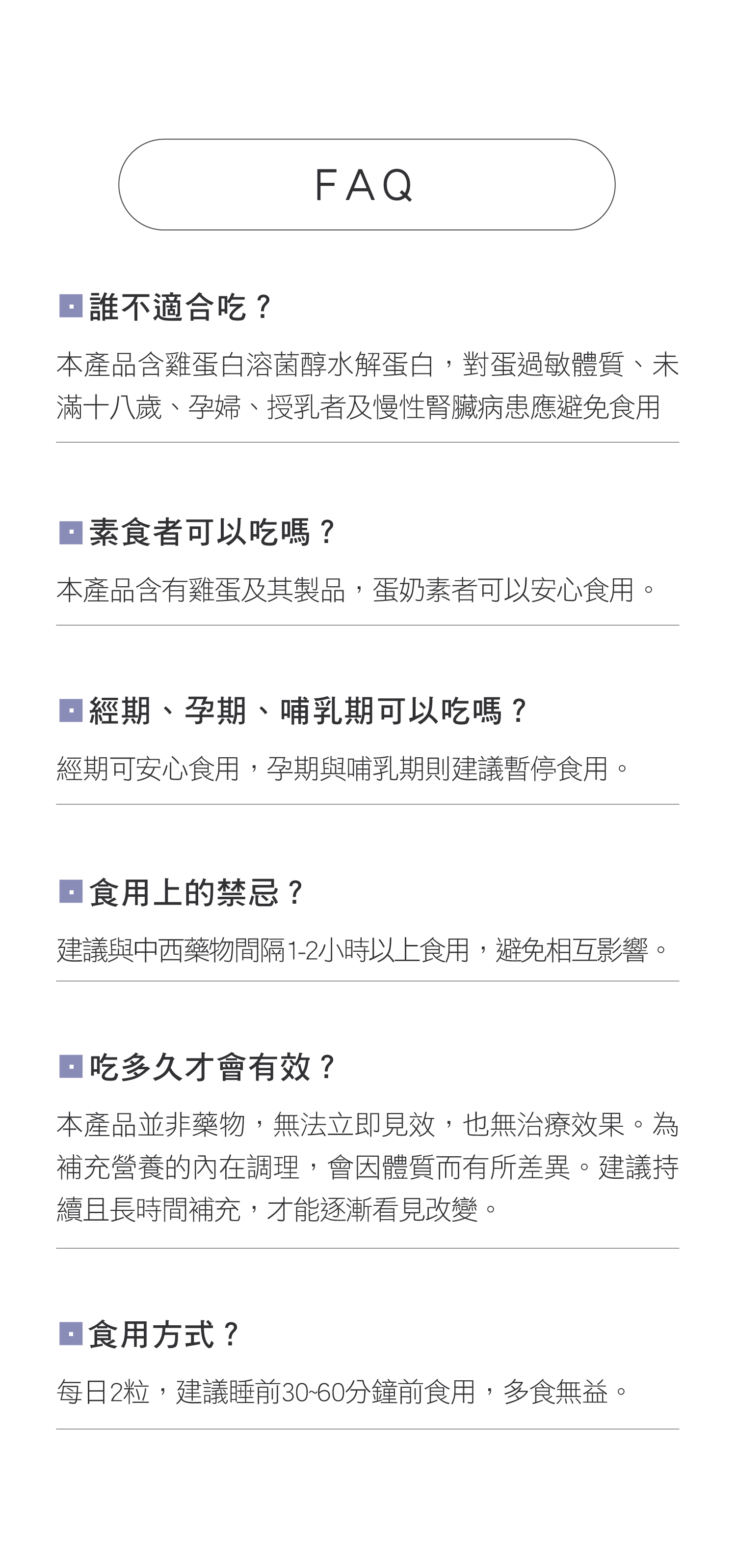 ■ 本產品含雞蛋白溶菌醇水解蛋白,對蛋過敏體質、未滿十八歲者、孕婦、授乳者及慢性腎臟病患應避免食用。