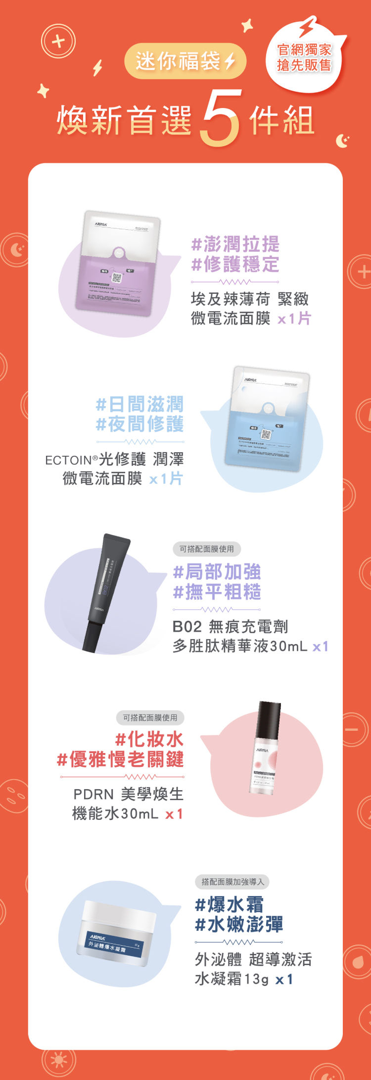 精選 AKIMIA 人氣修護與緊緻科技明星,從肌底啟動煥新機制,一組完成關鍵保養升級。無論是第一次接觸 AKIMIA,或想快速體驗多款高效成分,這都是輕鬆無負擔的入門首選。