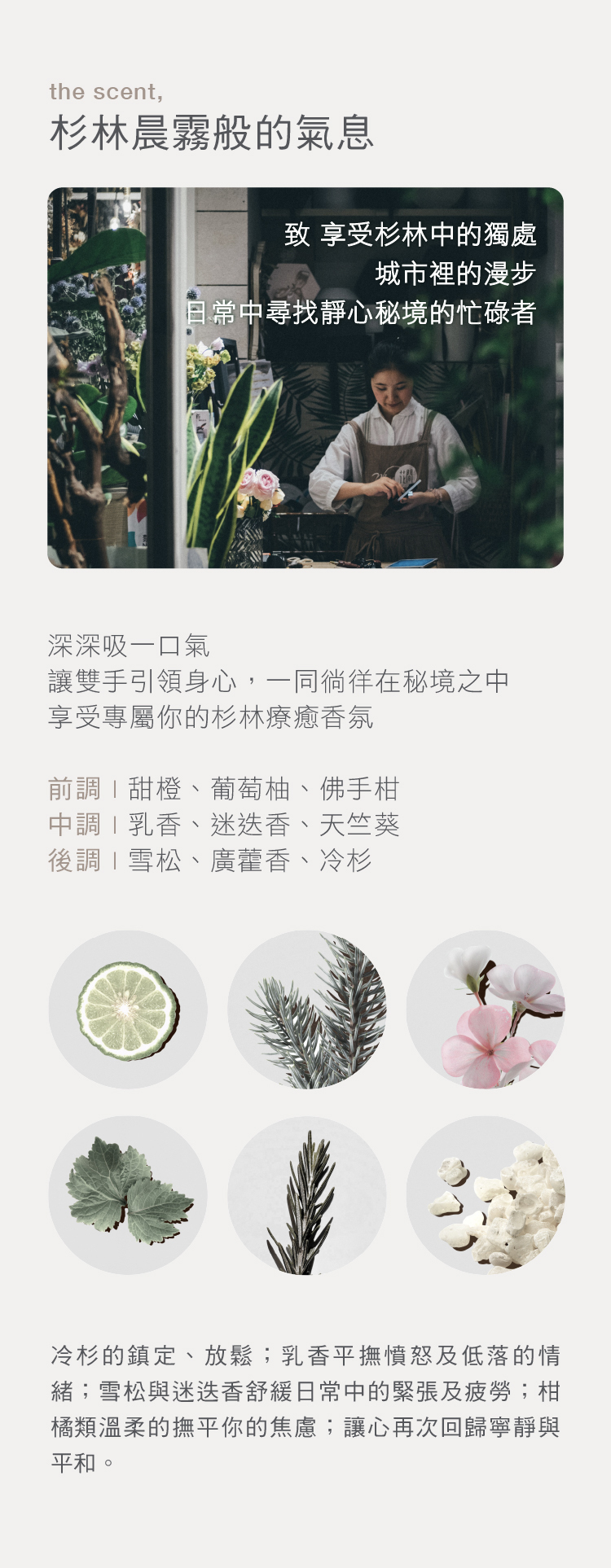天然精油在情緒減壓上有很大的幫助,美體乳裡的冷杉精油有鎮定、放鬆的助益;乳香平撫憤怒及低落的情緒; 雪松與迷迭香舒緩日常中的緊張及疲勞;柑橘類溫柔的撫平你的焦慮;讓心再次回歸寧靜與平和。