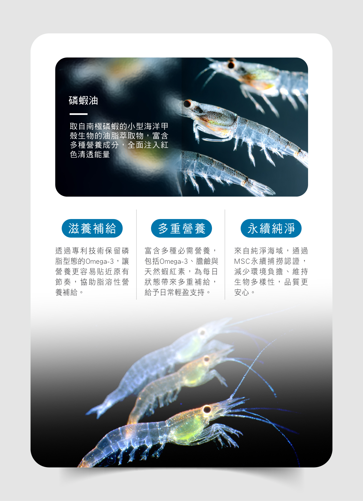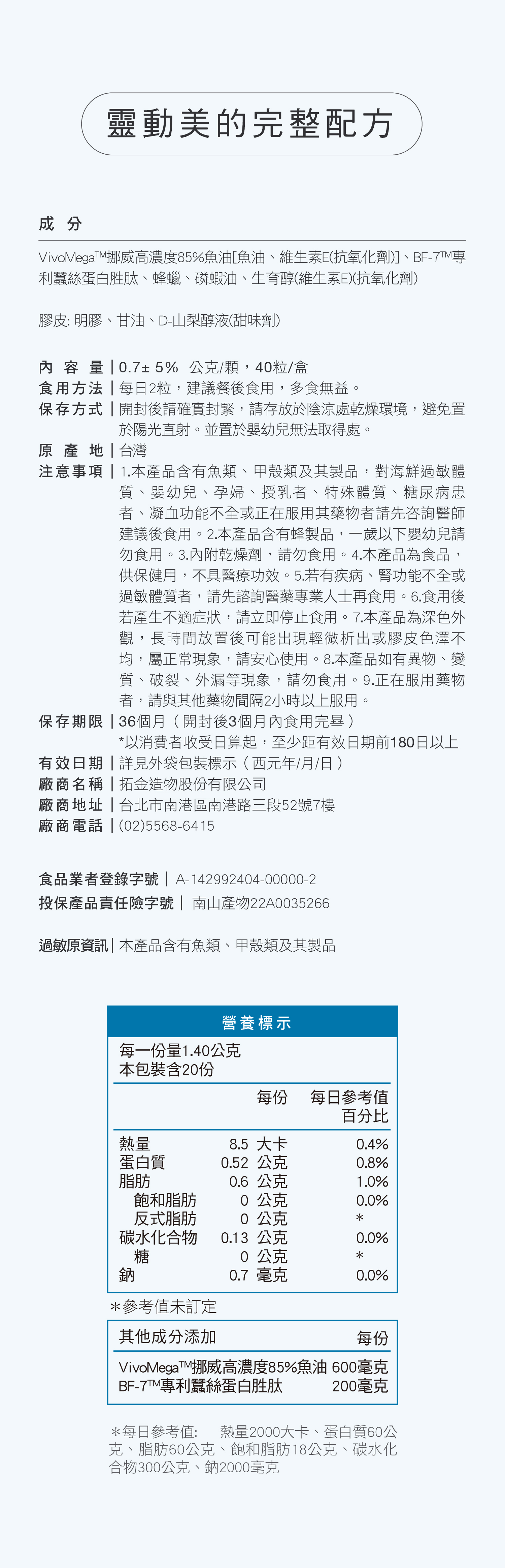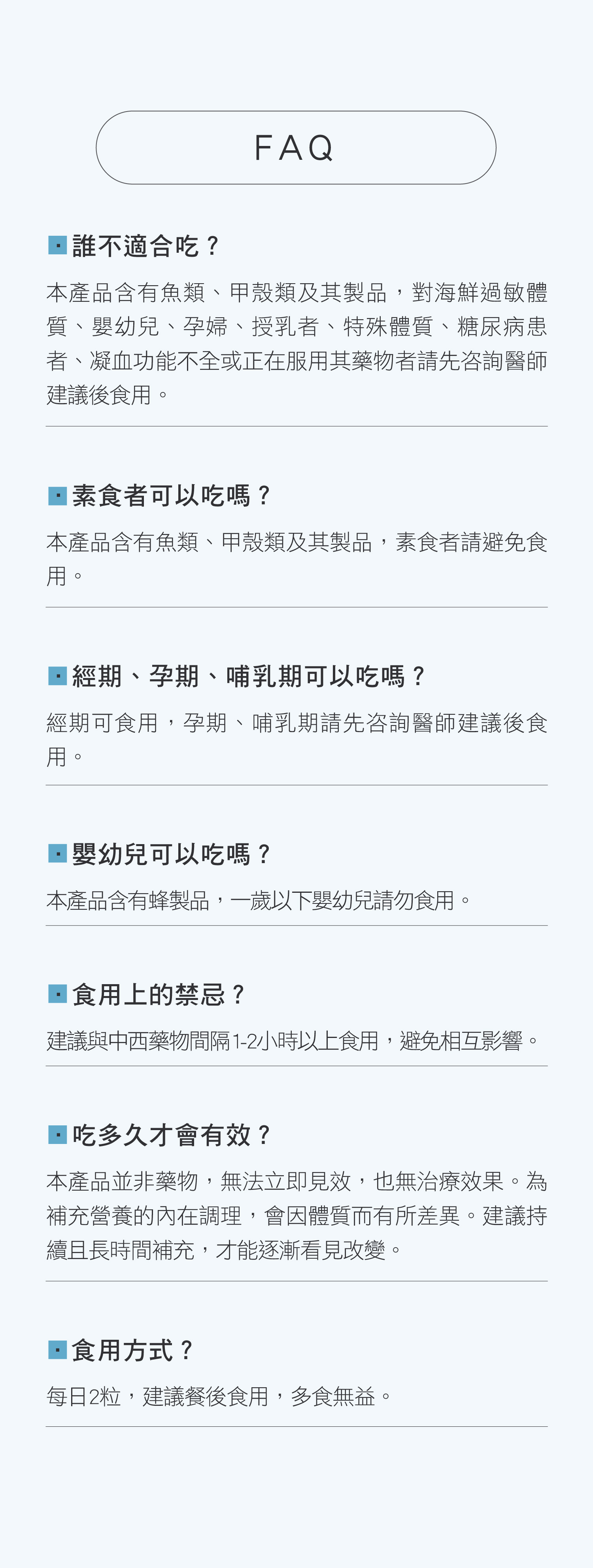 ■ 本產品含有魚類、甲殼類及其製品,對海鮮過敏體質、嬰幼兒、孕婦、授乳者、特殊體質、糖尿病患者、凝血功能不全或正在服用其藥物者請先咨詢醫師建議後食用。