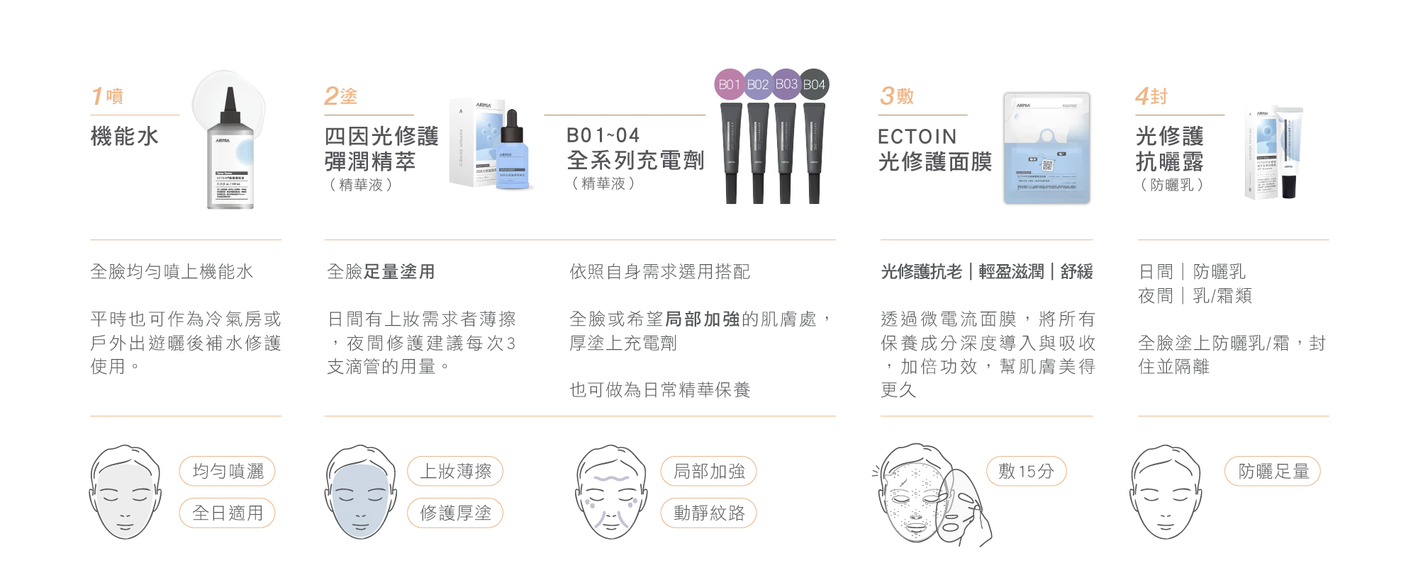 在無開放性傷口的前提下,建議3-7天內,先以保濕款做修護,讓⽪膚保持⽔潤。待膚況穩定後再使用其他功效型產品。