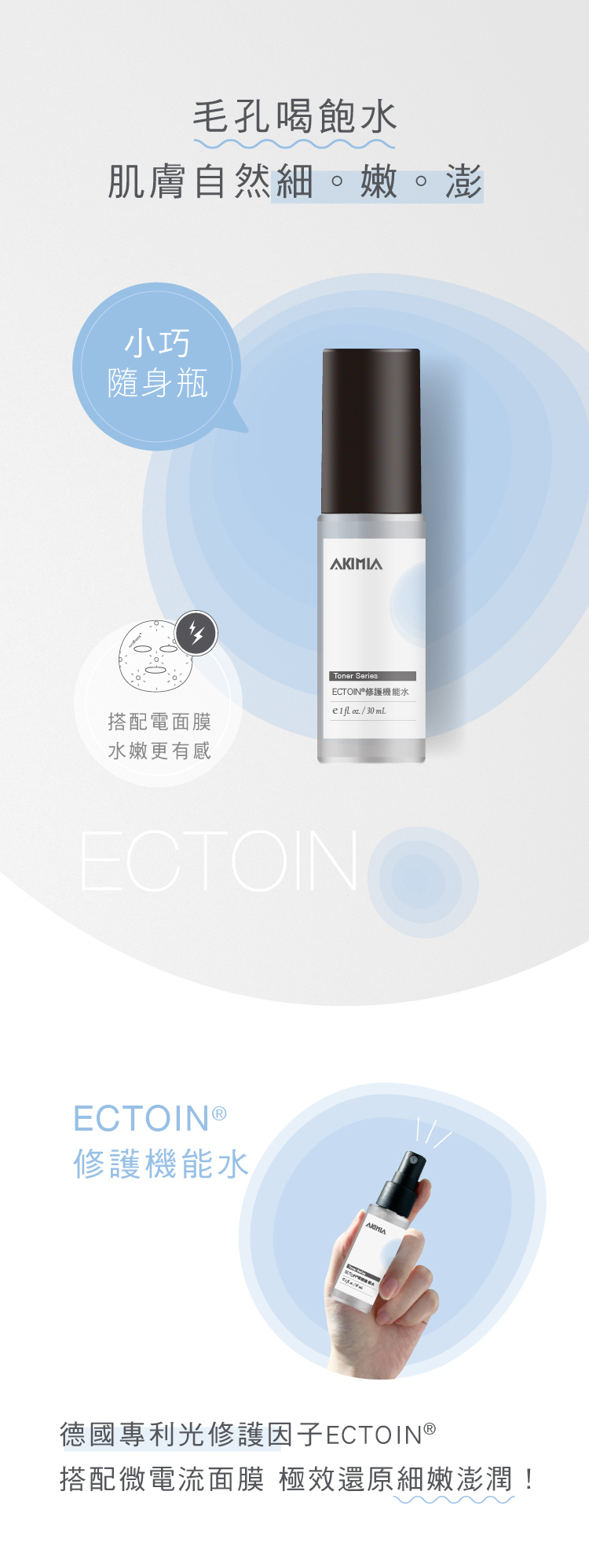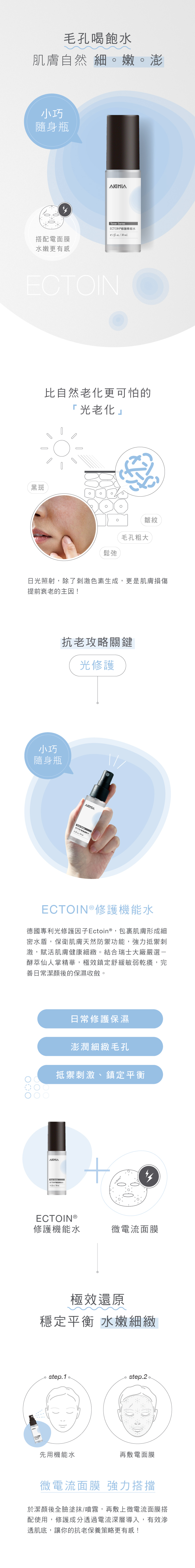 AKIMIA推薦每週三次,於潔顏後,全臉塗抹/噴霧,再搭配微電流面膜敷用,達到深層滲透、加倍功效的修護保養!